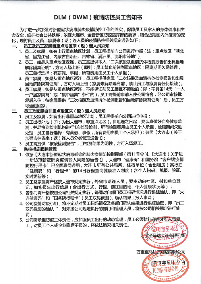 DLM(DWM)端午節(jié)期間疫情防控員工告知書
